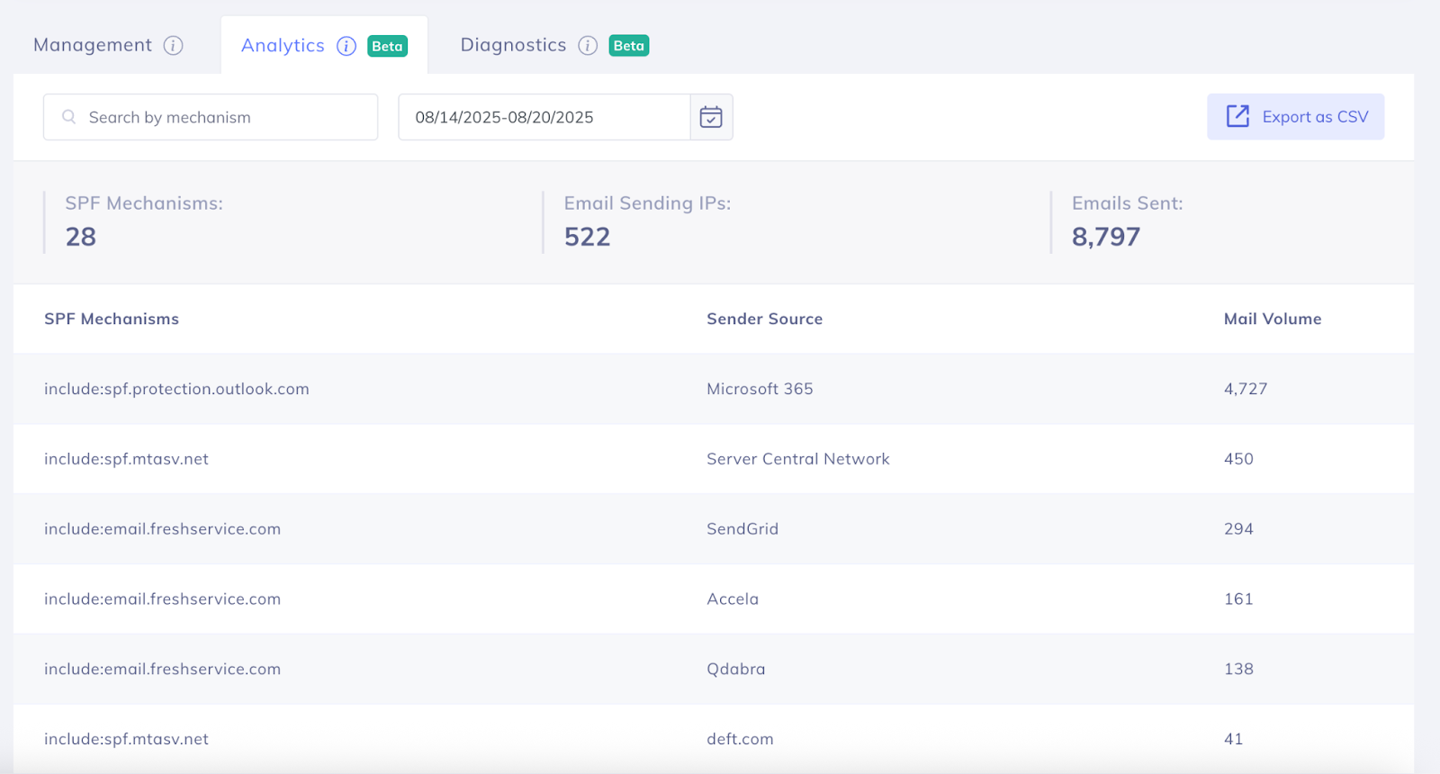 - Racionalice los registros SPF - Al revisar los datos de los últimos 6 meses, puede identificar las fuentes inactivas y eliminarlas de forma segura de su registro SPF.