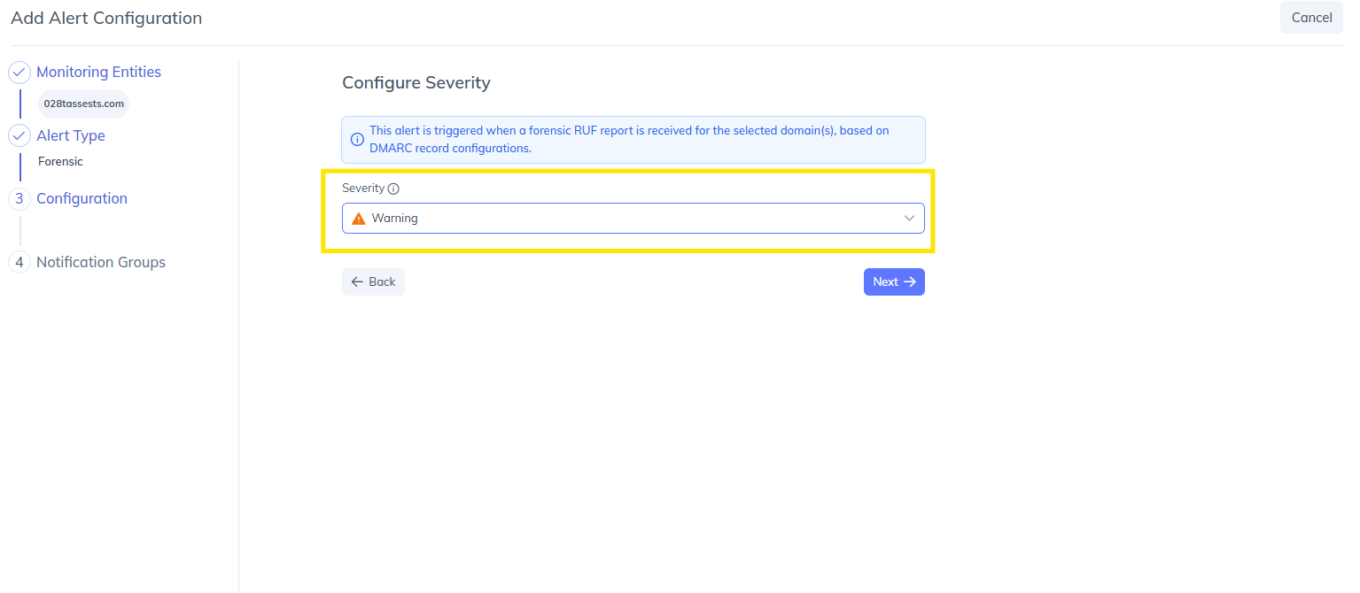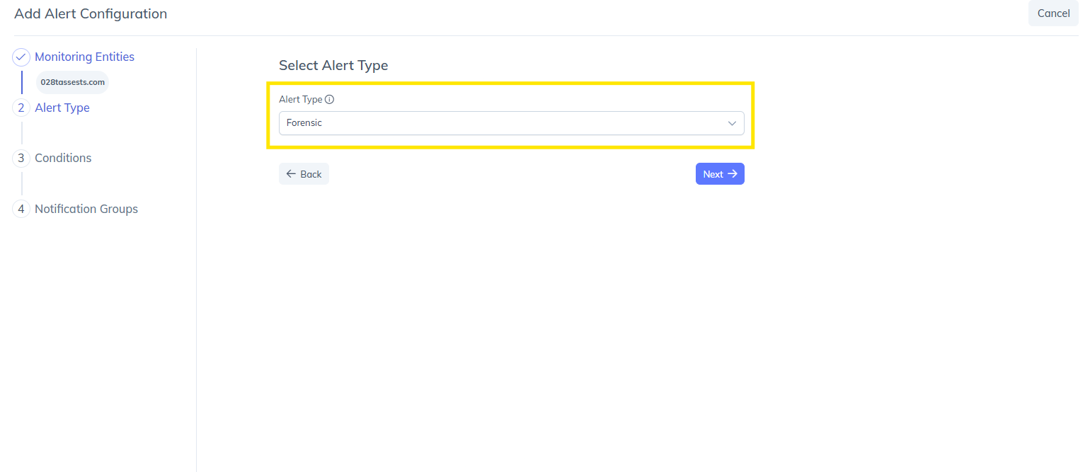 Seleccionar Forense como tipo de alerta y continúe haciendo clic en Siguiente.