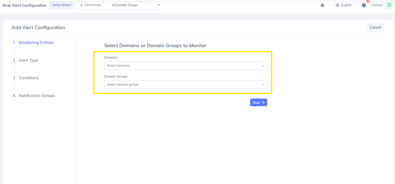Selecciona los dominios o grupos de dominios que deseas supervisar y haz clic en Siguiente.