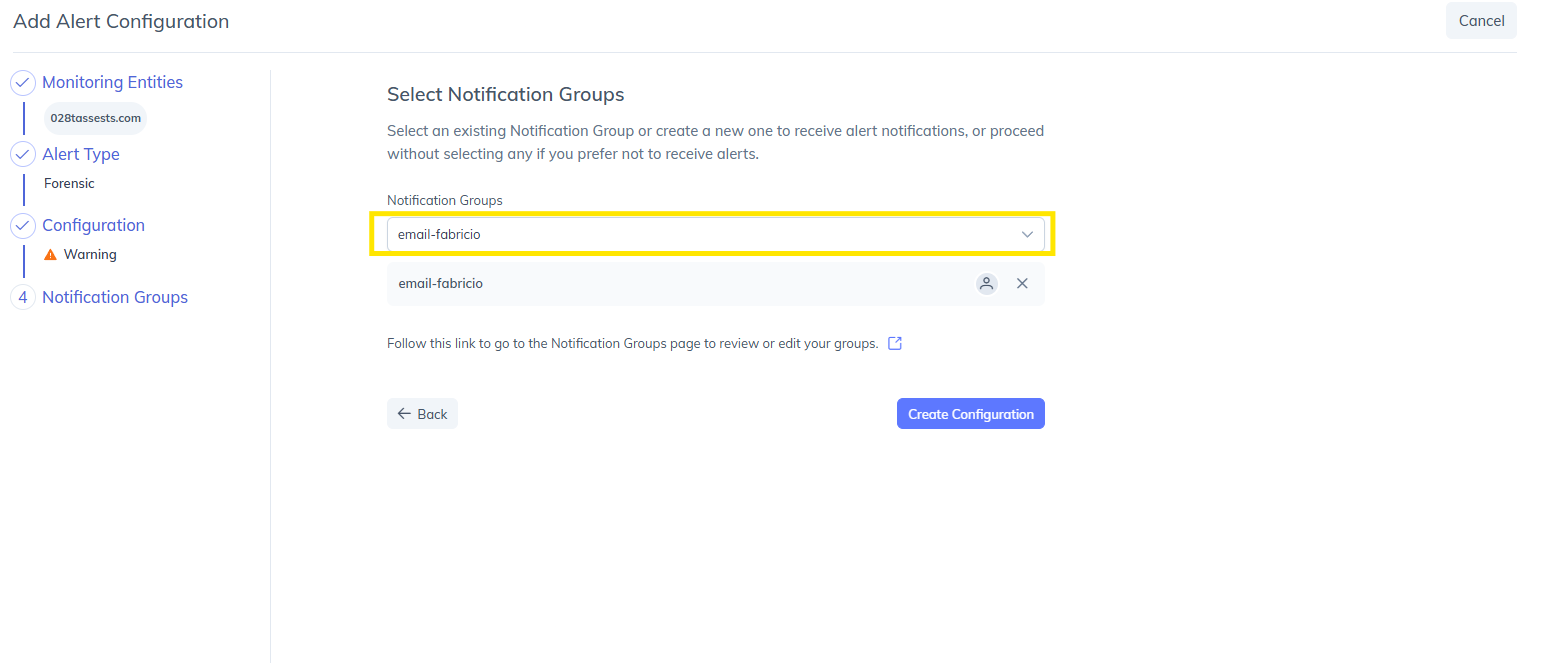 Selecciona un grupo de notificaciones ya existente para recibir alertas.