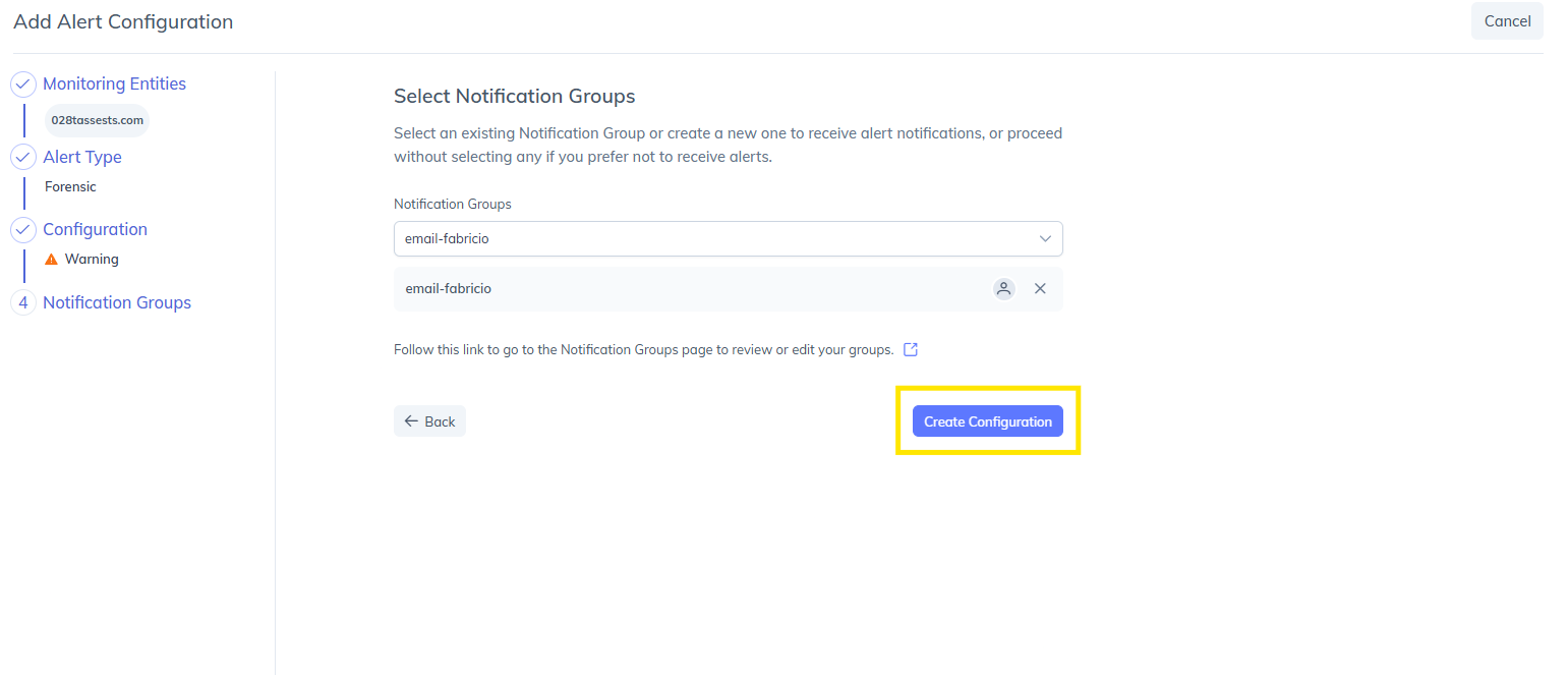 Después de seleccionar el grupo de notificaciones, haz clic en Crear configuración.